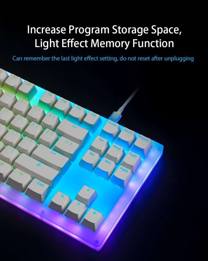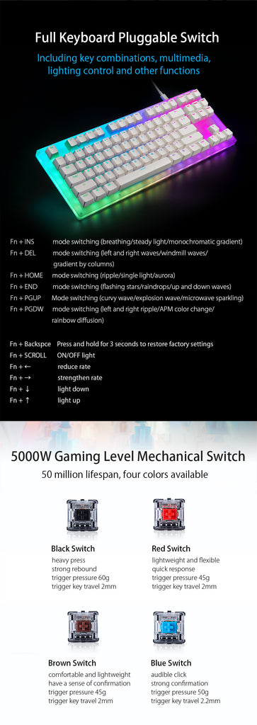 The PMMA plexiglass material used in the keyboard's construction allows for a 360º full translucent glazed panel, which creates a fantasy light effect that is sure to impress. The keyboard also has a full keyboard pluggable switch, allowing for easy DIY switch changes to customize your gaming experience